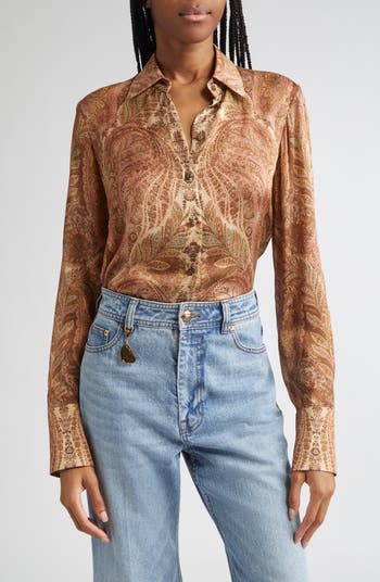 An embroidered crest details the chest of a luminous shirt crafted from dazzling silk.