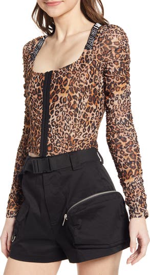 Boned for structure, this alluring crepe corset top goes fierce and wild in leopard spots—while statement taping at the neckline adds a signature accent.