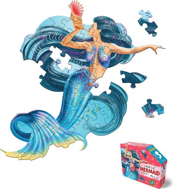 MADD CAPP: I AM LIL' MERMAID - 48 PIECE PUZZLE - Find Your Wave! Unique, mermaid-shaped 48-piece jigsaw puzzle for ages 4 and up. Poster-sized when completed. Puzzle pieces are oversized for easy handling. Each puzzle comes with an educational Madd Capp Fun Facts booklet. On one side is a fold-out puzzle image to hang as a poster or use as a reference. The flipside is chock-full of cool information! Did you know, for instance, that mermaids are magical? Just one kiss, and you'll breathe – easy and free – under the sea! 48 INTERLOCKING PIECES: Finished size: 25" x 24" (poster size). Semi-gloss image. Unique Mermaid-shaped border. No square corners, no straight edges… just a little extra challenge and a lot more fun. Large pieces are sized just right for small hands to hold and manipulate (good for folks with limited dexterity too). Mounted on premium quality chipboard (dust-free!). Random cut, interlocking puzzle pieces are thick and sturdy. Puzzle pieces come fully separated with cleanly cut edges that fit together snugly. Makes amazing wall décor. Glue it, then mount the masterpiece! PACKAGED in Madd Capp’s signature five-sided box – durable, tamperproof, and sized just right to secure 48 puzzle pieces. Box size: 9" x 7" x 3". Pieces come packed in a biodegradable and compostable bag. Includes Madd Capp Fun Facts and full puzzle image. Sustainably sourced and recycled materials. No single-use plastics. Also available as a 1000-piece 38" x 37" poster-sized puzzle!