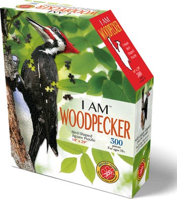 Madd Capp’s 300-piece I AM WOODPECKER has a unique, bird-shaped border – wings, crest, perch, and all! No square corners, no straight edges… just a little extra challenge and a lot more fun (a few hours, depending on your skill level). To bring the woodpecker to life, Madd Capp puzzlers typically build from the inside out, rather than the outside in. The finished puzzle is poster-sized (14” x 29”) and – with a semi-gloss, photo-realistic image – pretty impressive looking! Included with each puzzle is an “extra” – an educational Fun Facts booklet. On one side is all kinds of interesting info about the animal you’re puzzling. On the flipside is a full puzzle image to use as a reference or hang as a poster. Packaged securely in Madd Capp’s signature five-sided box, puzzles are designed to be displayed on a shelf, just like books in a library. For ages 10 and up.