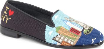 A cushioned footbed and leather lining offer lasting comfort in this classic flat enlivened with a hand-stitched needlepoint design that captures the vibrant energy of the Big Apple.