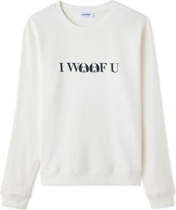 White unisex / woman sweatshirt with black stroked "I Woof U" print. In one size,