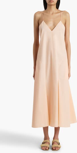The body-grazing fit of a slipdress is achieved through the unorthodox fabrication choice of cotton poplin, adding breathability and a touch of structure to the classic style.