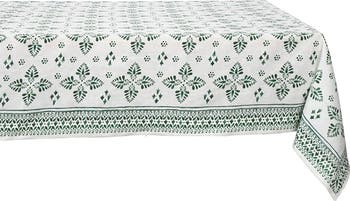 Set the stage for a homey, inviting tablescape with this linen tablecloth that evokes the folkloric beauty of hand-painted European tiles.