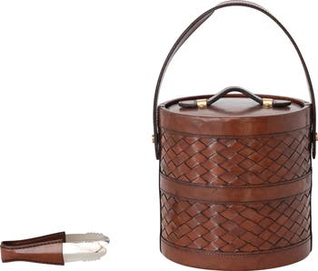 • An exquisite ice bucket featuring reclaimed wood and woven leather in a rich cognac color