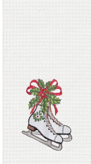 - Featuring an ice skates motif accented with holly berries for a nostalgic Christmas look that feels festive yet versatile enough to display through winter. The soft waffle texture provides absorbency while enhancing visual interest on hooks, rods, or countertops.