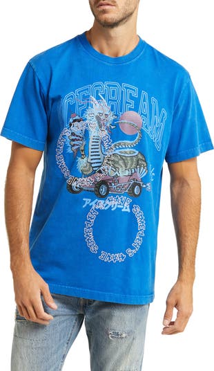 A zany family portrait fronts a soft all-cotton tee with a familiar logo arcing in the background.