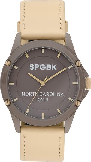 Brushed hardware accents the case of this sleek watch featuring a minimalist face printed with an homage to SPGBK's North Carolina roots. A rich leather strap adjusts for a comfortable fit.