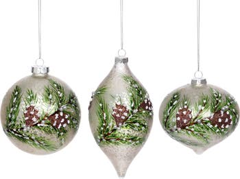 These are elegant Christmas ornaments with an iced pinecone design. Each ornament features hand-painted pine branches and pinecones, accented with delicate white snow and glitter details for a frosted effect. The set includes three different shapes—round, teardrop, and onion—adding variety and sophistication to holiday décor.
