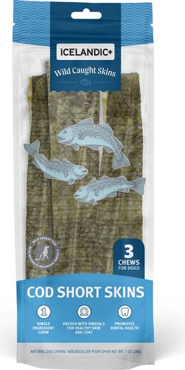 COD SHORT SKIN STRIPS: 8-10" - 3PK - Treat your dog to the pure goodness of Icelandic+ Cod Skins, sourced from the clean, icy waters surrounding Iceland. These wholesome snacks are made from 100% wild-caught cod and air-dried using sustainable geothermal energy—an ancient Icelandic technique dating back to the Viking Age. Each strip delivers a naturally irresistible flavor and satisfying crunch that dogs love. These single-ingredient chews contain absolutely no additives, preservatives, supplements, artificial colors, fillers, or by-products—just pure Icelandic cod. Rich in Omega-3 and Omega-6 fatty acids, they help promote healthy skin, a shiny coat, and overall well-being. The firm texture helps reduce plaque and tartar buildup to support everyday dental health, making them a delicious and beneficial treat for your dog’s routine. Perfect for pups with protein sensitivities, these clean, easily digestible treats offer a simple, nutrient-dense reward you can feel confident giving. KEY HIGHLIGHTS: Single ingredient chew. Sustainably wild-caught fish, air-dried using geothermal energy as Vikings did in 900 A.D. Packed with Omega-3 for healthy skin & coat. Promotes dental health. No artificial colors, fillers or preservatives. Pure Icelandic Cod. Nothing else, nothing more. Pure. Wild. Irresistible. The best treats for the most loved pets.