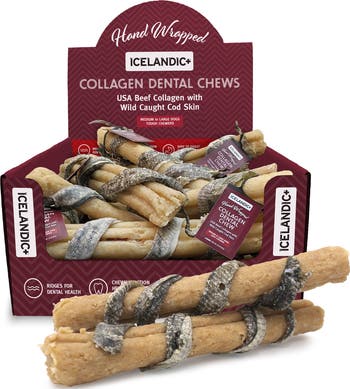COLLAGEN DENTAL CHEW STICK: BEEF COLLAGEN WRAPPED W/ COD SKIN - 8" - 18PK - Treat your dog to a delicious, healthy chew that supports dental and whole-body wellness. Each Icelandic+ Beef Collagen Dental Chew is handcrafted from USA-sourced beef collagen and wild-caught Atlantic cod skin, spiral-wrapped for a fun, layered texture dogs can’t resist. Ridges promote good dental health by helping to reduce tartar and plaque build-up for cleaner teeth and healthier gums. Rich in Omega-3 essential fatty acids, these chews naturally support healthy skin and a shiny coat while providing major chewing satisfaction. The unique 2-in-1 design—beef collagen wrapped with flavorful fish skin—makes for a long-lasting, high-protein chew that’s as nutritious as it is entertaining. It’s a safe, natural alternative to rawhide, fully digestible and gentle on your dog’s stomach. Each 8" chew is 100% edible, 100% natural, and made from just two wholesome ingredients with no additives, preservatives, or artificial ingredients. Sustainably sourced and packed with flavor, they’re ideal for keeping even picky chewers engaged. The Icelandic+ Beef Collagen Dental Chew’s textured surface acts like a toothbrush, naturally “scrubbing” teeth and massaging gums. Some minor gum bleeding may occur initially—just as with human flossing—but this signals improved oral health. With regular use, you’ll notice whiter teeth, stronger gums, and a happier, healthier smile your veterinarian will appreciate. IMPORTANT: As with all dog chews, supervision is recommended while your dog enjoys their Icelandic+ Beef Collagen Dental Chew. Product of Iceland. Packed in Iceland. 100% Viking.