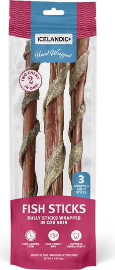 FISH STICKS: BULLY STICK WRAPPED IN COD SKIN: 12" - 3PK - Treat your dog to a delicious, nutrient-rich chew that goes above and beyond the ordinary. Each piece begins with premium USA-sourced beef pizzle, then is thoughtfully hand-wrapped in wild-caught cod skin, creating a flavorful two-in-one combo dogs can’t resist. DENTAL HEALTH: These natural treats offer a satisfying texture that helps reduce plaque and tartar buildup while supporting overall dental health. HEALTHY SKIN & COAT: Packed with quality protein to help maintain strong muscles, these chews also promote healthy skin and a shiny coat. This flavorful, high-protein chew keeps pups mentally stimulated and happily occupied for longer. Easily digestible and made without artificial flavors, colors, fillers, or preservatives, this wholesome rawhide alternative delivers pure, simple ingredients your dog will love. KEY HIGHLIGHTS: Long-lasting healthy chew. USA beef pizzle wrapped with wild-caught fish. Supports dental health. Excellent source of protein. No artificial colors, fillers or preservatives. 2 chews in 1. Protein packed for a healthy reward. The best treats for the most loved pets.