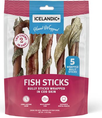 FISH STICKS: BULLY STICK WRAPPED IN COD SKIN: 6" - 5PK - Treat your dog to a delicious, nutrient-rich chew that goes above and beyond the ordinary. Each piece begins with premium USA-sourced beef pizzle, then is thoughtfully hand-wrapped in wild-caught cod skin, creating a flavorful two-in-one combo dogs can’t resist. DENTAL HEALTH: These natural treats offer a satisfying texture that helps reduce plaque and tartar buildup while supporting overall dental health. HEALTHY SKIN & COAT: Packed with quality protein to help maintain strong muscles, these chews also promote healthy skin and a shiny coat. This flavorful, high-protein chew keeps pups mentally stimulated and happily occupied for longer. Easily digestible and made without artificial flavors, colors, fillers, or preservatives, this wholesome rawhide alternative delivers pure, simple ingredients your dog will love. KEY HIGHLIGHTS: Long-lasting healthy chew. USA beef pizzle wrapped with wild-caught fish. Supports dental health. Excellent source of protein. No artificial colors, fillers or preservatives. 2 chews in 1. Protein packed for a healthy reward. The best treats for the most loved pets.