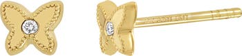 A dainty diamond centers these whimsical butterfly stud earrings handcrafted from gleaming 18-karat gold.