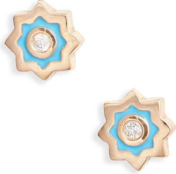 Bright blue enamel adds cool color to these 14-karat gold stud earrings centered with diamonds.