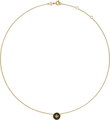 Add a dash of Tory's classic elegance to your look with a delicate goldtone necklace anchored by an enameled pendant bearing the iconic double-T logo.