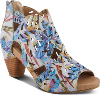 Hand-painted leather adds ample sophistication to this heeled sandal complete with a cushioned footbed.