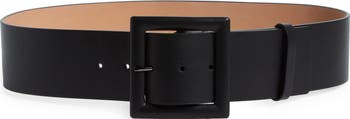 The label's iconic impact defines a wide, waist-wrapping belt that's fashioned from matte leather and centered with a square buckle.