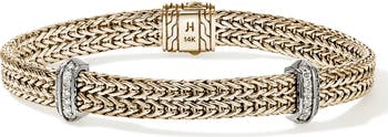 The art of Balinese chain weaving is masterfully displayed on this handcrafted 14-karat gold bracelet illuminated by pavé diamond stations.