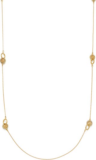 Accessorize with the signature style of this delicate necklace highlighted by the brand's iconic medallion stations that dazzle with sparkle pavé.