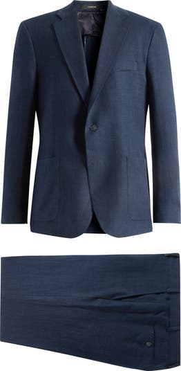 Unstructured tailoring relaxes the formality of a suit made of linen in a neutral hue with rounded shoulders emphasizing the easy fit. The flat-front trousers sit below the waist and stay comfortably roomy down the legs to maintain the balance between traditional detailing and all-occasion versatility.