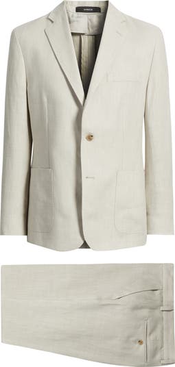 Unstructured tailoring relaxes the formality of a suit made of linen in a neutral hue with rounded shoulders emphasizing the easy fit. The flat-front trousers sit below the waist and stay comfortably roomy down the legs to maintain the balance between traditional detailing and all-occasion versatility.