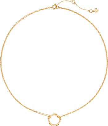 A studded circle pendant serves as the focal point of a dainty necklace plated in glossy goldtone.