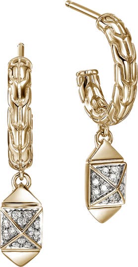 Pavé diamond studs dangle from these 14-karat gold hoop earrings hand-carved in the label's signature chain motif.