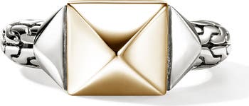 A gleaming 14-karat gold stud is the focal point of this sterling silver ring hand-carved in the label's signature chain motif.