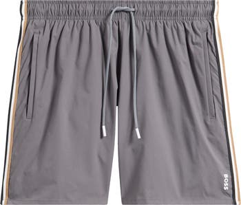 Lightweight, quick-drying fabric made with lots of easy stretch keeps you moving comfortably in and out of the water in swim trunks designed with a soft lining. Contrast stripes race up the sides for a retro finish.