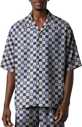 A checkerboard print patterned in icons of travel and leisure inspires unforgettable getaways in a camp shirt made of soft, silky viscose in a fit that gives you plenty of room to relax. Wear it on its own or layered and unbuttoned to change up your look without ever losing your style.
