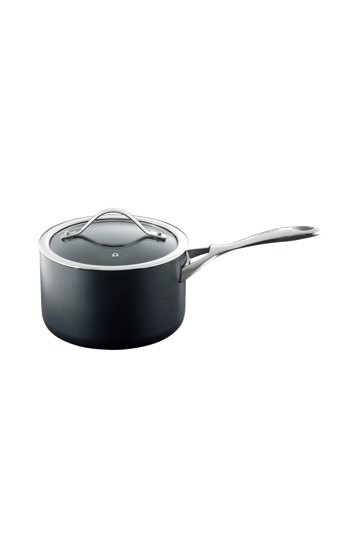 The Cuisine::pro® iD3® Hard Anodized 2.9 Qt Saucepan with Lid is ideal for reheating, small pastas, or crafting sauces and soups.