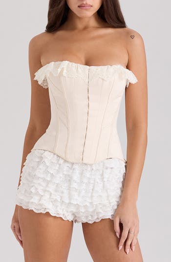 A romantic strapless corset top edged in frilly lace is built with streamlined seaming and signature corsetry boning for a figure-flaunting silhouette.