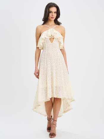 Ethereal and effortlessly romantic, the Idra Dress brings delicate details to life in a graceful midi slip silhouette. Designed in a soft beige floral crochet fabric, this sleeveless dress features a ruffled breast decoration, lace trim, and a subtle keyhole cutout for a touch of charm. The adjustable straps and stretchable fit ensure comfort, while the trailing hem adds movement and elegance. Finished with an invisible zipper and an alluring backless design, the Idra is perfect for warm-weather soirées, vacation evenings, or any moment you want to feel beautifully undone. Materials: Crochet Lace Length from underarm: Approx 42.5 inch / 108 cm Stretch Factor: High stretch Clean: Dry-clean only Model Is Wearing A Size XS (US-2) Model Is 5'11' Color may vary due to lighting on images. The product images (without model) are the closest to the true color of the product.