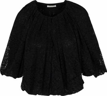 This ethereal cream lace bubble top exudes romantic elegance with a modern twist. Crafted from exquisite corded gallon lace, it features a voluminous silhouette and playful bubble hem, creating a light and airy look perfect for any occasion.