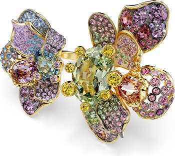 Faceted crystal petals catch the light on this stunning cocktail ring boasting an open-band and gorgeous flowers that remains in bloom season after season.