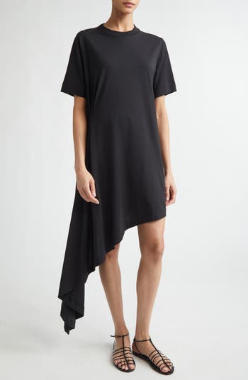 This knit T-shirt dress is made of Supima® cotton, chosen for its ultrasoft hand and gentle drape. The dress is carefully pleated at one side, waterfalling down to create a dynamic asymmetric hemline.