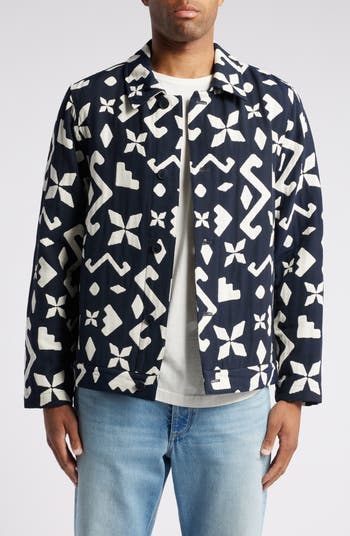 A bold geo pattern brings modern, eye-catching style to this boxy cotton-blend jacket topped with a crisp spread collar.