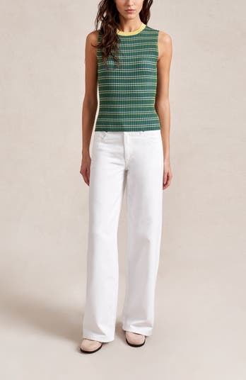This fitted, ribbed, sleeveless crewneck multicolor striped shell is made from 100% merino wool and is extra cozy when paired with a cardigan.
