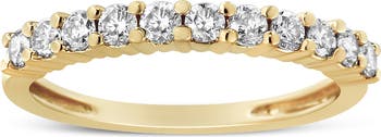 Elegant and timeless, this diamond wedding band features your choice of either 0.5 or 1.0 carat total weight of diamonds with eleven individual stones. This exquisite IGI certified 10 karat yellow gold wedding ring has eleven beautiful round, brilliant cut white diamonds in shared prong settings set side by side into the face of this glamorous band. The ring has vertical fluting down on the sides of the band. This classic yet bold modern band style ring makes a great gift for any special occasion and can serve as a promise ring, engagement ring, or anniversary band as well. Whether worn for daytime glamour or evening sparkle, this straight band is gorgeously versatile. It’s a timeless treasure she’ll enjoy wearing every day.