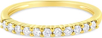 Elegant and timeless, this IGI certified 10K yellow gold diamond band features 0.25 carat total weight of tiny round diamonds prong set into the face of the slender band. The ring features 11 round, brilliant cut diamonds. The side of the prong settings has fluting design details. The ring has a high shine, polished finish. This ring can serve as an engagement ring, wedding ring, anniversary band, or fashion statement. The sleek silhouette ensures that this band can stack with another ring. This authentic design is crafted of real 10 karat gold, a precious metal that will keep a tarnish-free shine for years to come. Whether worn for daytime glamour or evening sparkle, this modern band style ring is gorgeously versatile. Give her a gift that will perfectly complement her favorite ensemble.