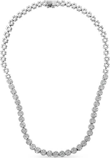As elegant as it is dramatic, this dazzling Riviera diamond necklace elevates any attire. Expertly crafted in warm weaves of 14K white gold, this eye-catching design features flower-shaped clusters of shimmering round diamonds paired with polished gold beads, creating this bold and breathtaking design. This magnificent pieces features 34 links with 7, pave-set round diamonds per link for an eye popping total of 238 diamonds. Regal and radiant with 8 carats of round cut diamonds, this 18.0-inch necklace secures with a hidden box clasp with safety latch for a secured fit. This unique treasure comes with a certificate from the IGI for added assurance. The necklace ships out in beautiful packaging for easy gift giving.