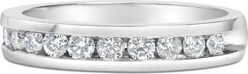 Elegant and timeless, this diamond wedding band features 1/2 carat total weight of diamonds with eleven individual stones. This exquisite IGI certified 18 karat white gold wedding ring has eleven beautiful round, brilliant cut white diamonds channel set side by side into the face of this half-eternity style band. This classic yet bold modern band style ring makes a great gift for any special occasion and can serve as a promise ring, engagement ring, or anniversary band as well. Whether worn for daytime glamour or evening sparkle, this straight band is gorgeously versatile. It’s a timeless treasure she’ll enjoy wearing every day.
