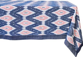 Inspired by ancient loom-weaving traditions, the distinctive blurred pattern of traditional Ikat is awash in sun-faded blush tones and breezy blues on a cotton tablecloth finished with a simple hand-stitched trim.