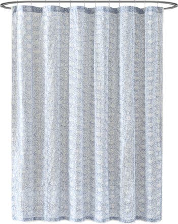 A dappled ikat pattern complements the eyelet fabric of this shower curtain that brings romantic elegance to your bathroom retreat.