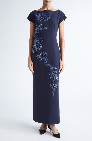 Lela Rose captures the wild splendor of American photographer Imogen Cunningham's pinhole-exposure still lifes with ikat-inspired floral embroidery on this columnar stretch-crepe gown. The single waterfall seam elegantly contours to your curves.