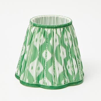 Our crisp Apple Green Ikat Scalloped Lampshade adds a fresh touch to your home.Elegant and chic, it features Serena Fresson's Ikat Fabric in a fabulous apple green with a matching darker green velvet trim.
