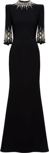 This dress combines modern minimalism with refined embellishment. The clean, fitted silhouette is framed by a high neckline and elegant elbow-length sleeves. Sparkling beadwork accents the neckline and sleeve cuffs, adding subtle glamour to the streamlined design. A sophisticated choice for occasions that call for understated elegance with a touch of brilliance.