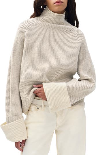 Contrasting trim brings a layered look to this warm, woolly sweater knit with shaker stitching and a cozy turtleneck.