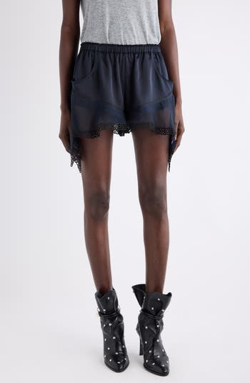 Sheer asymmetric panels with lacy trim add captivating detail to wide-leg shorts cut in a relaxed fit from stretch silk charmeuse.